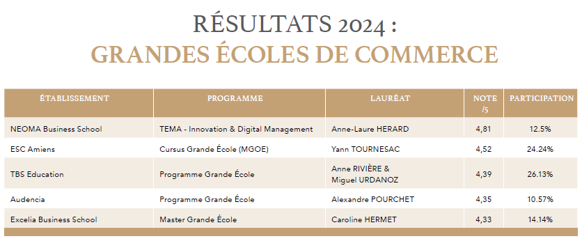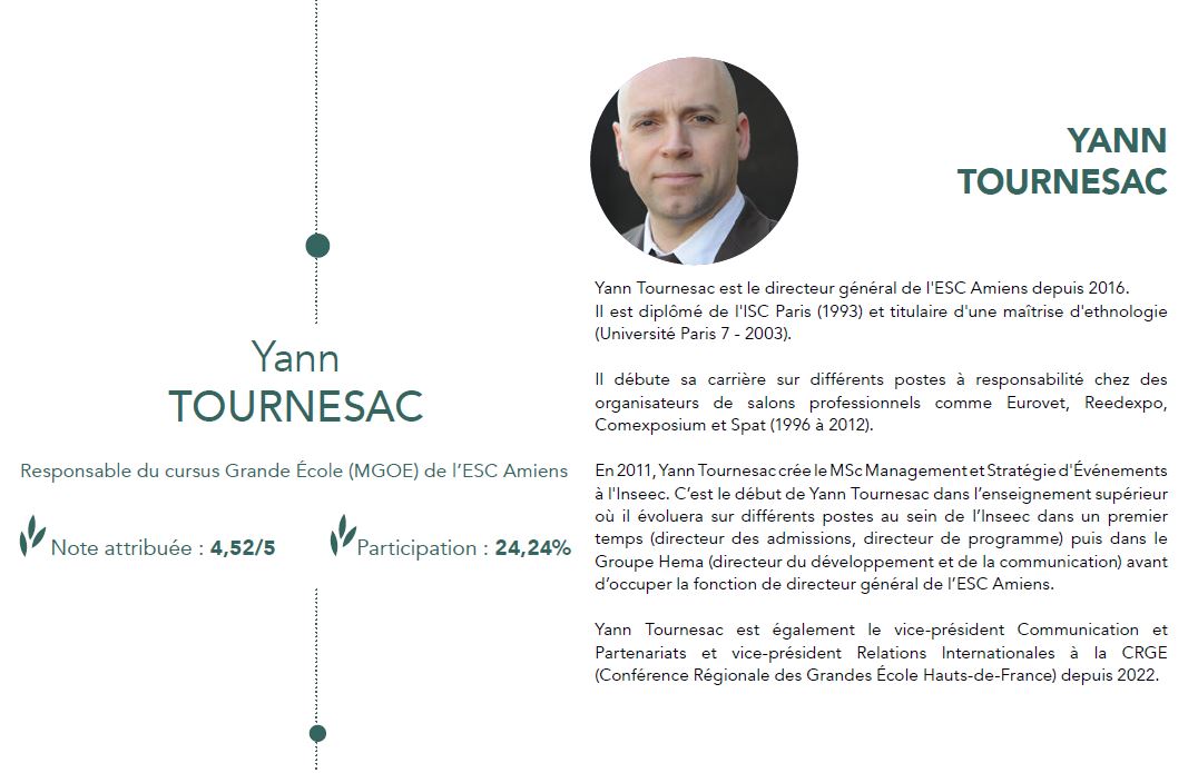 Et parmi plus de 2 000 programmes classés, 10 directeurs de programmes grandes écoles de commerce ou diplômes d’ingénieurs ont été retenus comme les meilleurs responsables de programmes français, dont Yann TOURNESAC, directeur général de l'ESC Amiens, pour son Cursus Grande École (programme MGOE).